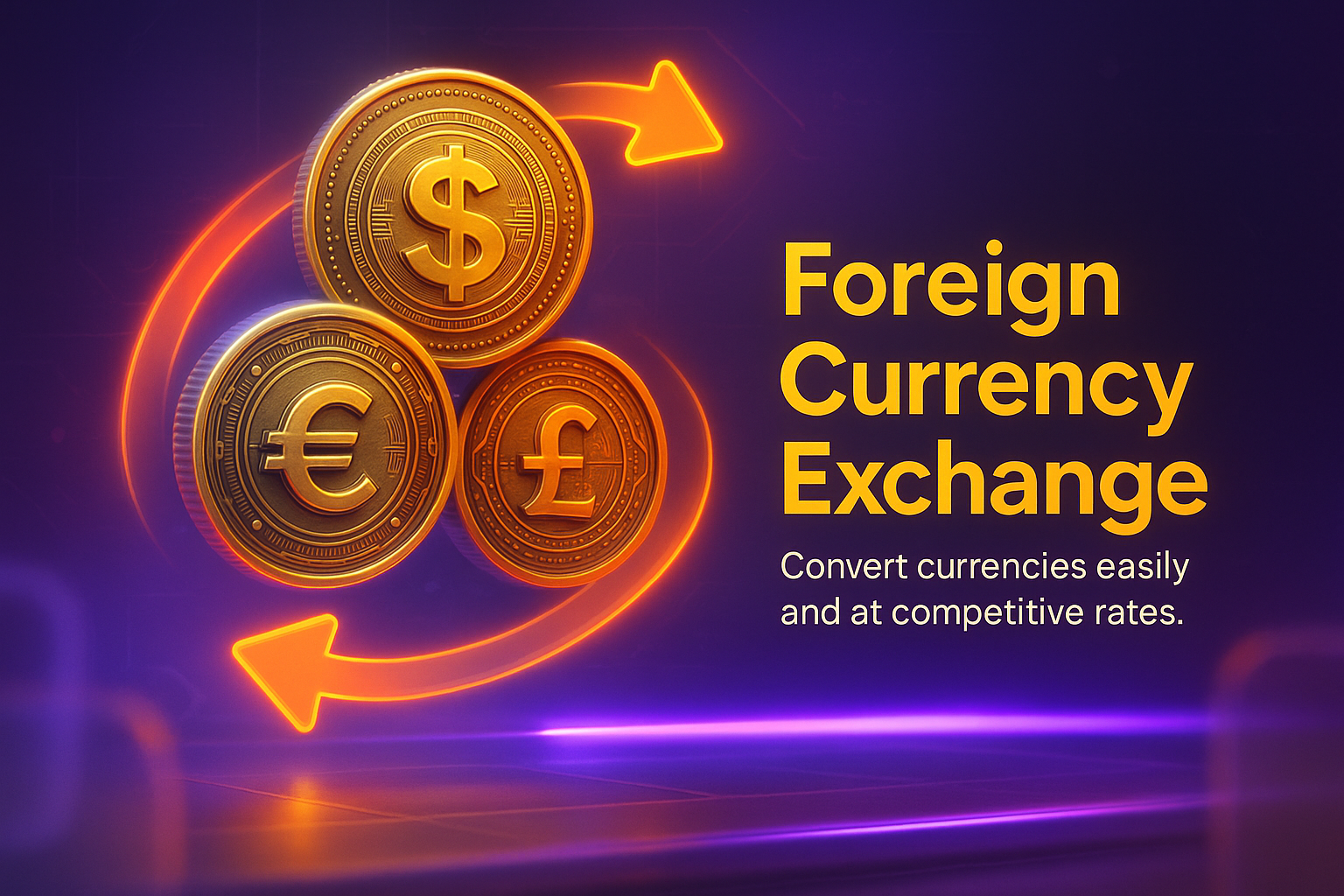 Vibrant graphic showcasing currency exchange with gold coin icons and glowing arrows, ideal for financial services marketing and promotional materials.