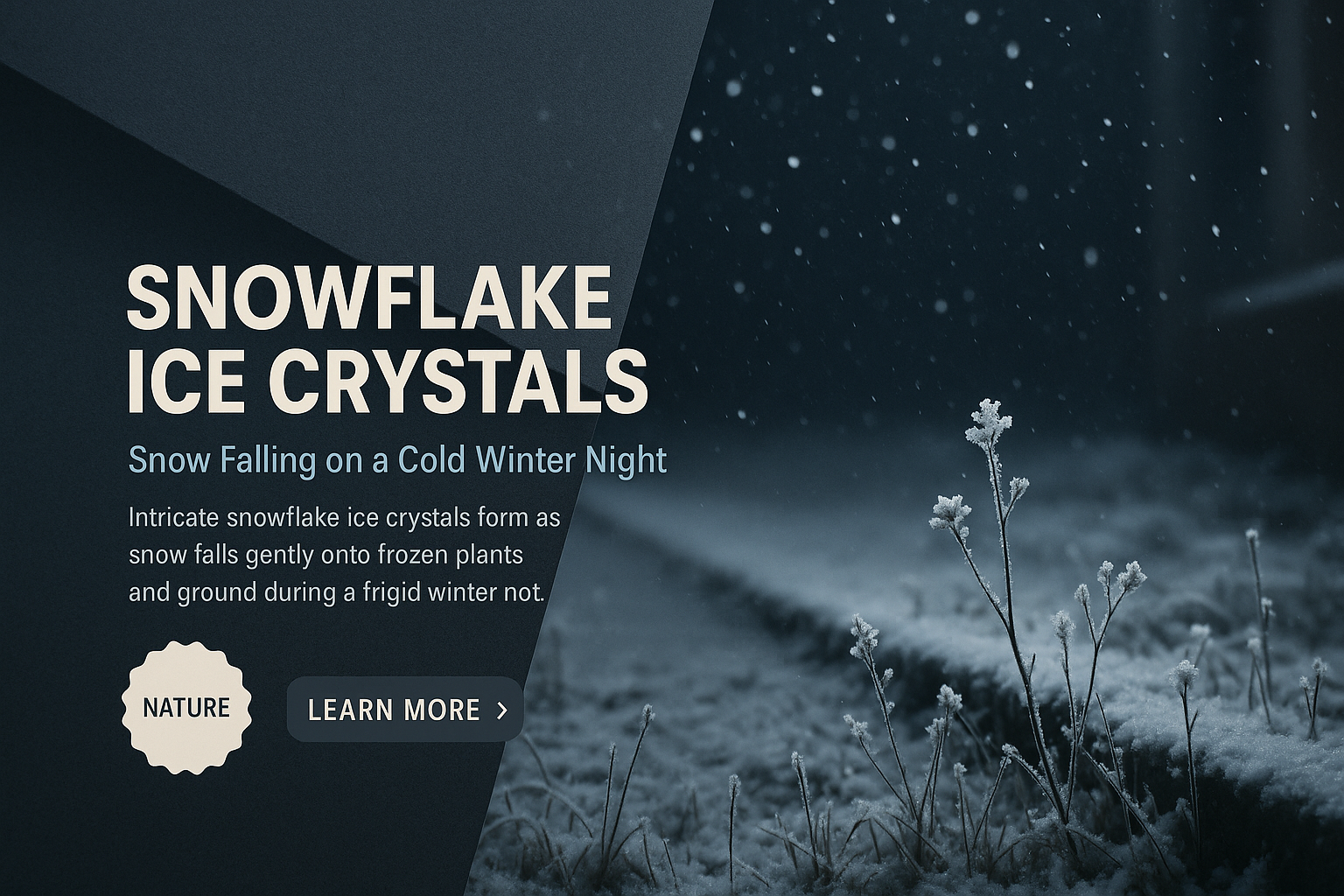 A serene winter night scene featuring snowflake ice crystals gently falling on frozen ground and plants, creating a peaceful and realistic atmosphere.