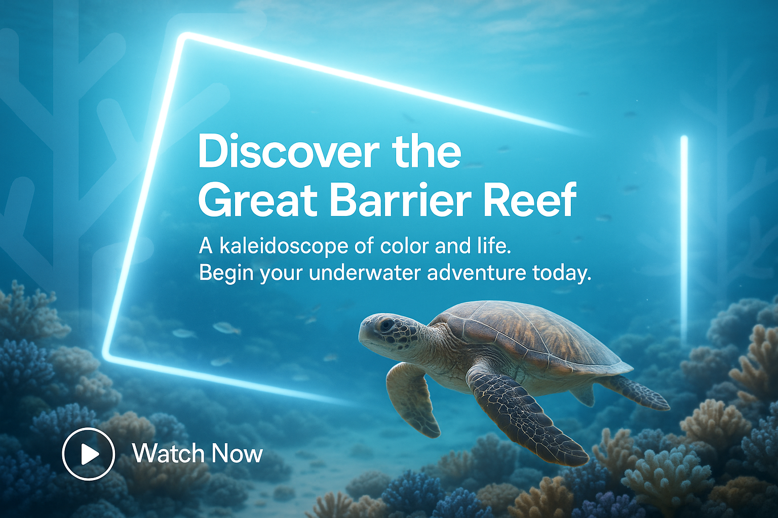 /Collection: /by davooda/Type: PNG/Engaging promotional graphic showcasing the Great Barrier Reef with a sea turtle. The vibrant underwater scene invites viewers to explore marine biodiversity, ideal for tourism or educational campaigns.