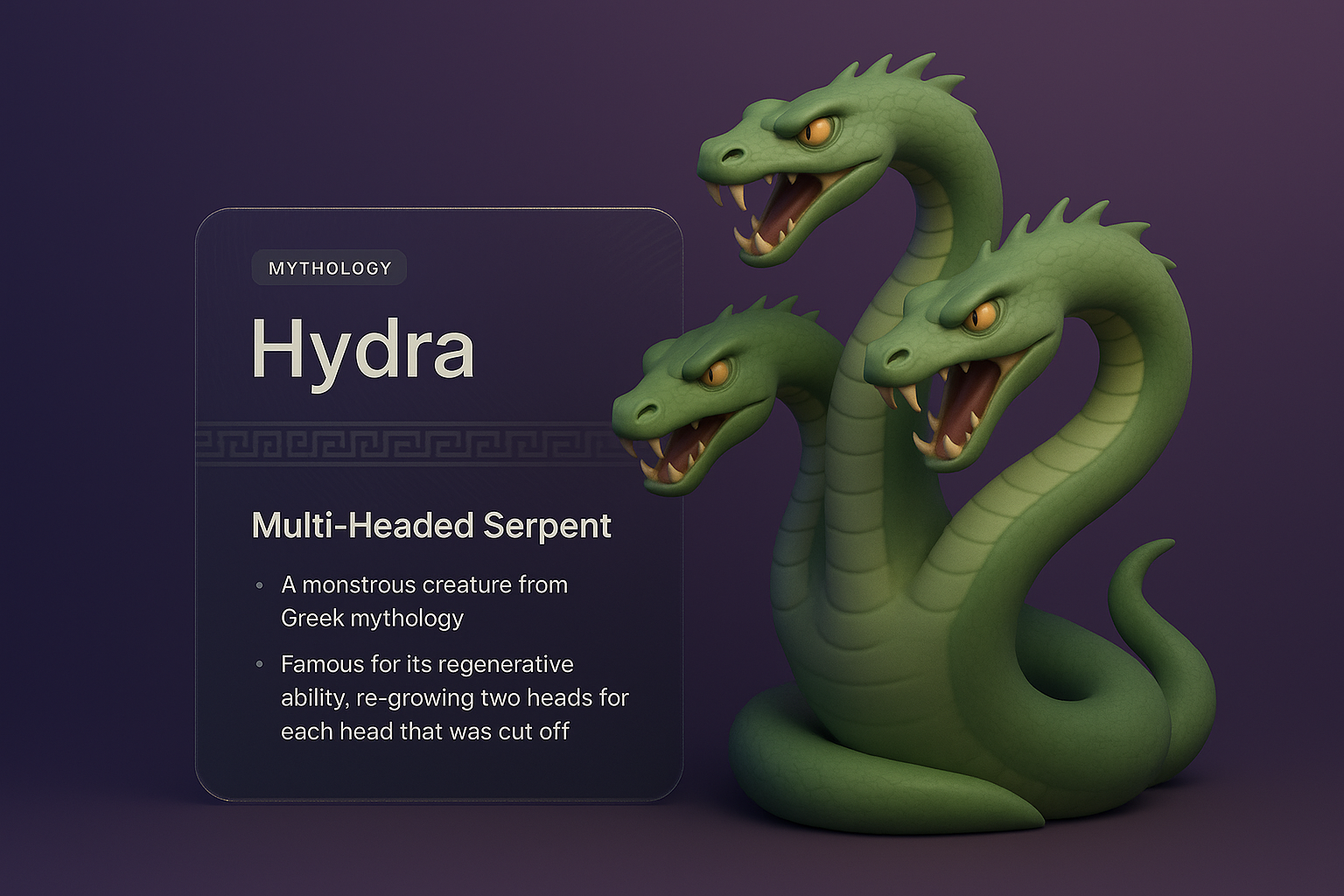 A captivating 3D illustration of a mythical hydra with three heads, accompanied by a sleek informational block featuring a dark panel and a decorative pattern, all set against a smooth gradient background.