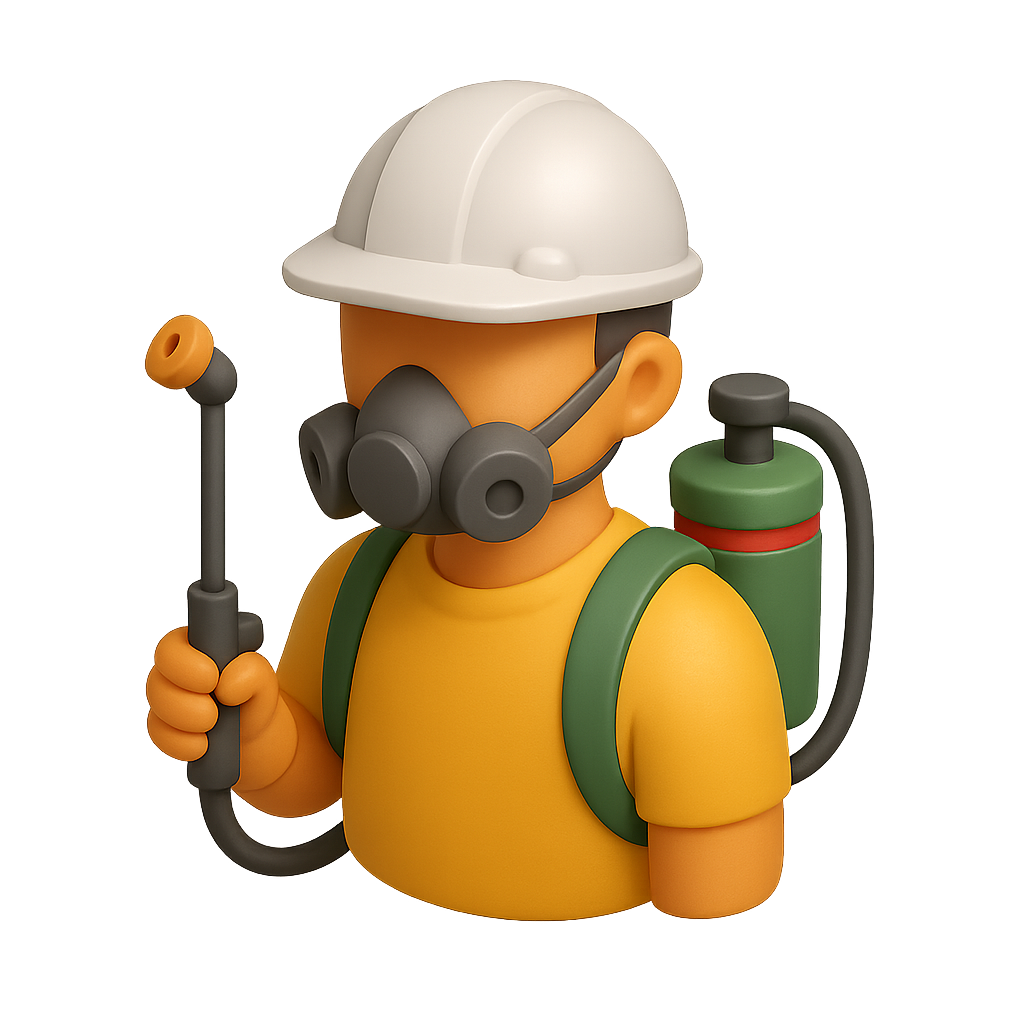 /Collection: /by davooda/Type: PNG/A stylized 3D icon of an exterminator wearing a helmet and a mask, holding pest control equipment. The design features a vibrant color palette and a transparent background.
