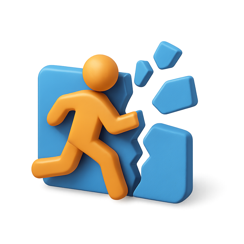 A vibrant isometric icon depicting a stylized figure breaking through a blue wall. The figure is orange, conveying action and movement, with a dynamic three-quarter view.