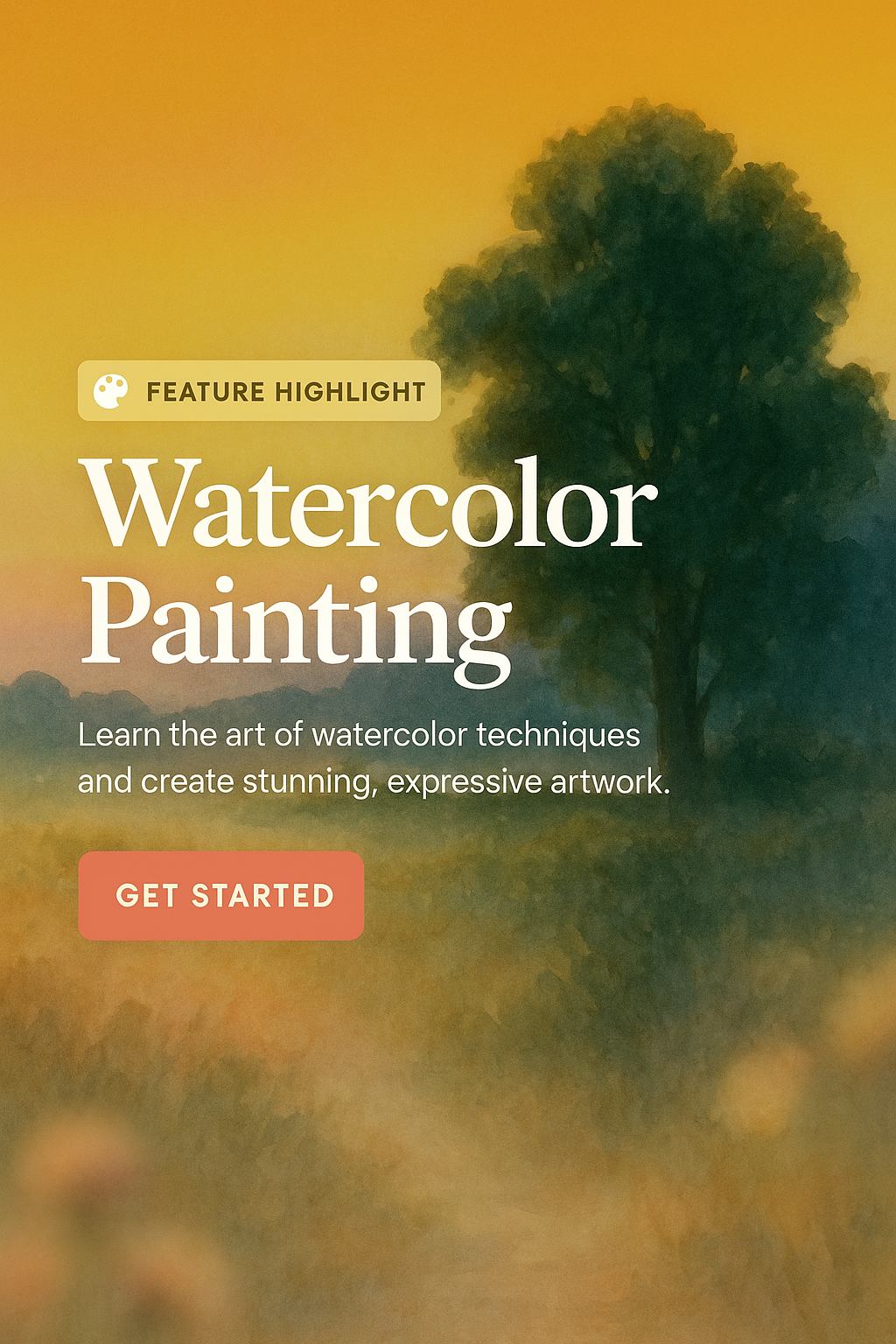/Collection: /by davooda/Type: PNG/A promotional graphic showcasing watercolor painting techniques. It features soft colors and a serene landscape, aimed at art enthusiasts looking to enhance their skills.