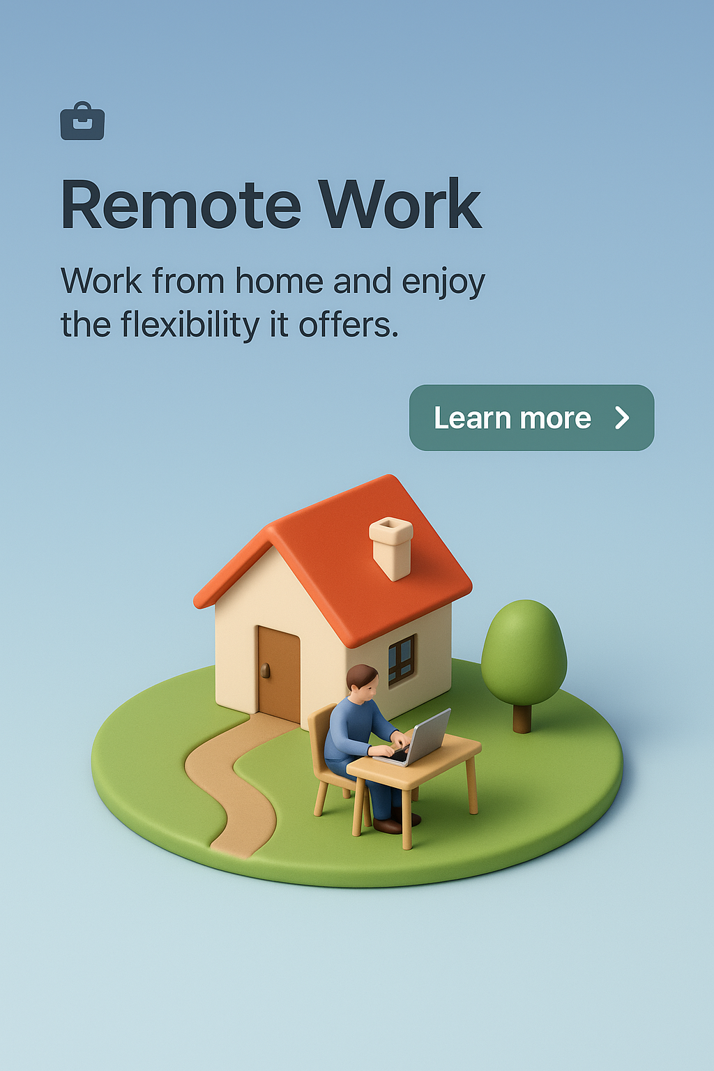 A minimalistic 3D illustration featuring a small house and a person working at a desk outside. The scene is set against a smooth gradient background, emphasizing the remote work theme.