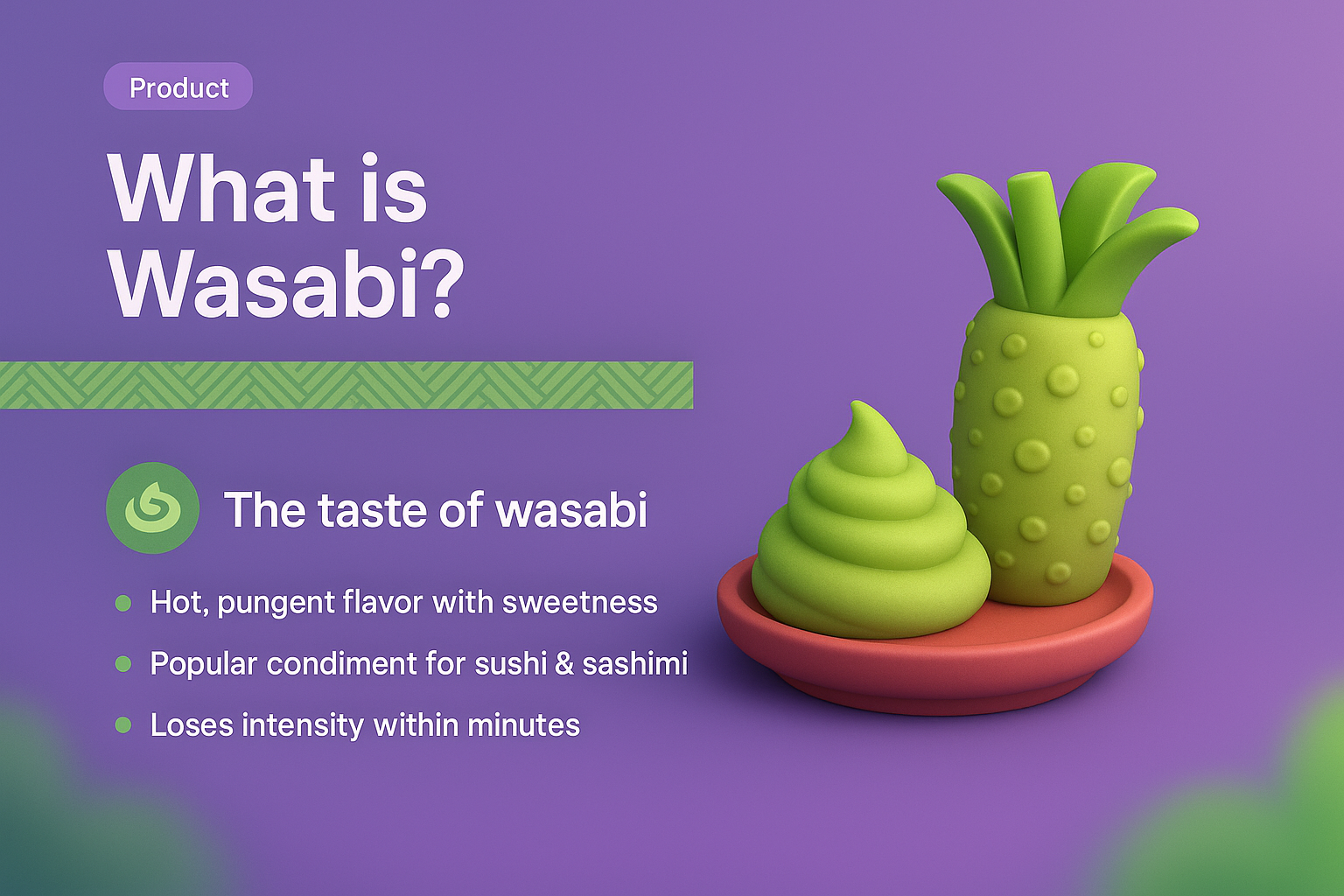 /Collection: /by davooda/Type: PNG/A colorful landing page featuring a 3D illustration of wasabi in a dish, emphasizing its unique flavor. The design includes bold headings, a subtle gradient background, and engaging bullet points.