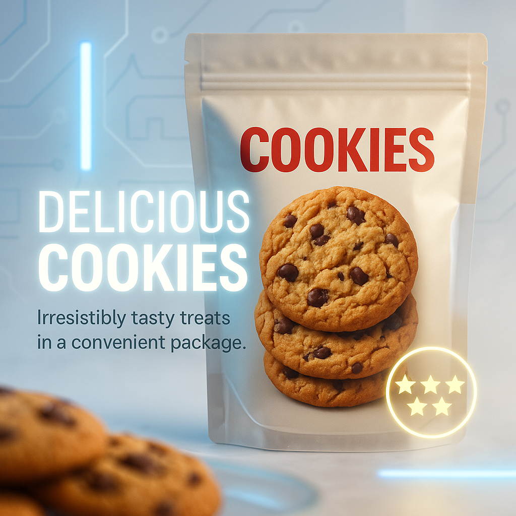Eye-catching packaging design for cookies featuring a modern aesthetic with appealing visuals. Ideal for e-commerce and food marketing campaigns.