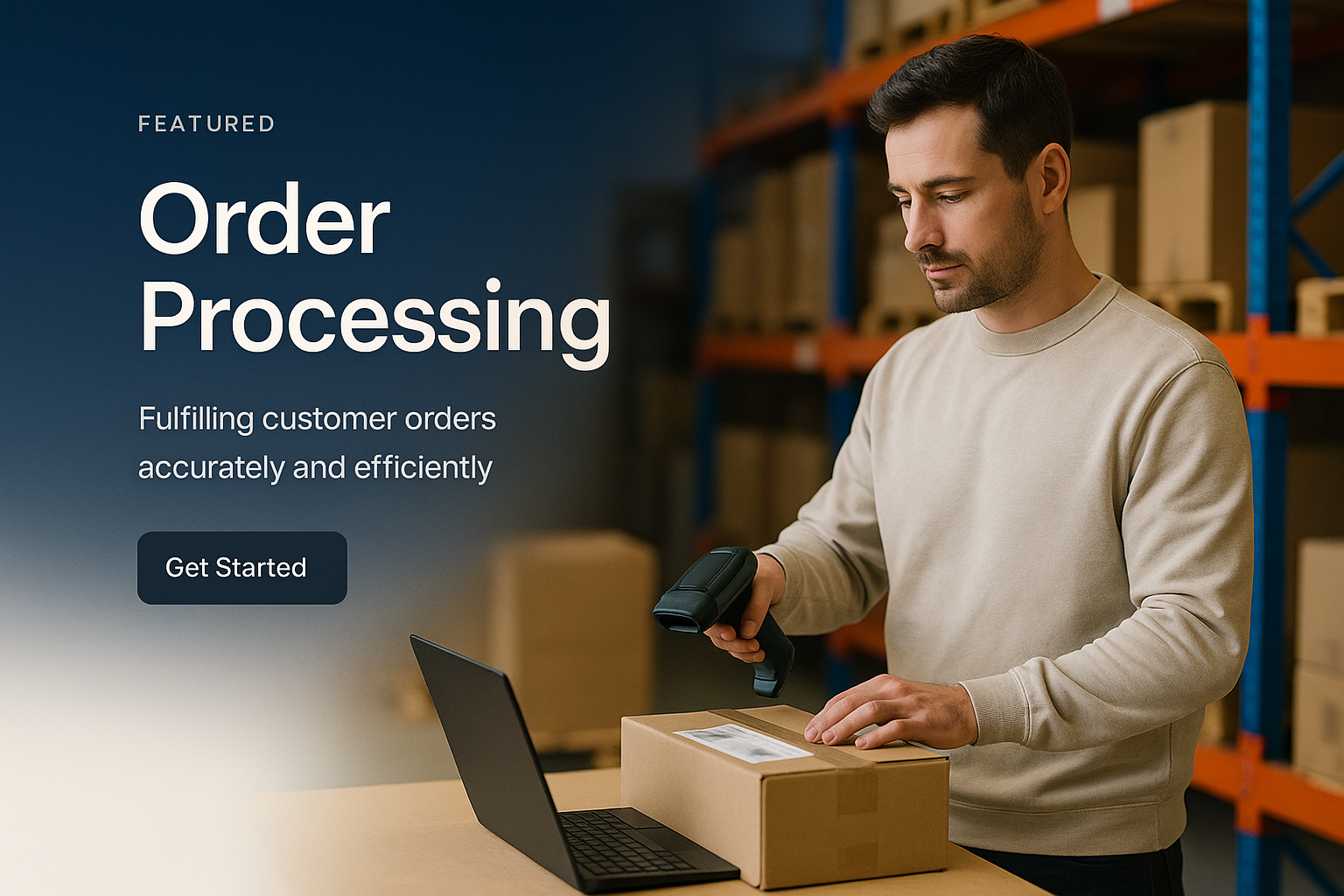 /Collection: /by davooda/Type: PNG/A professional illustration showcasing a man scanning a package in a warehouse setting, emphasizing order processing. The design features a clean layout with a gradient background and clear call-to-action.