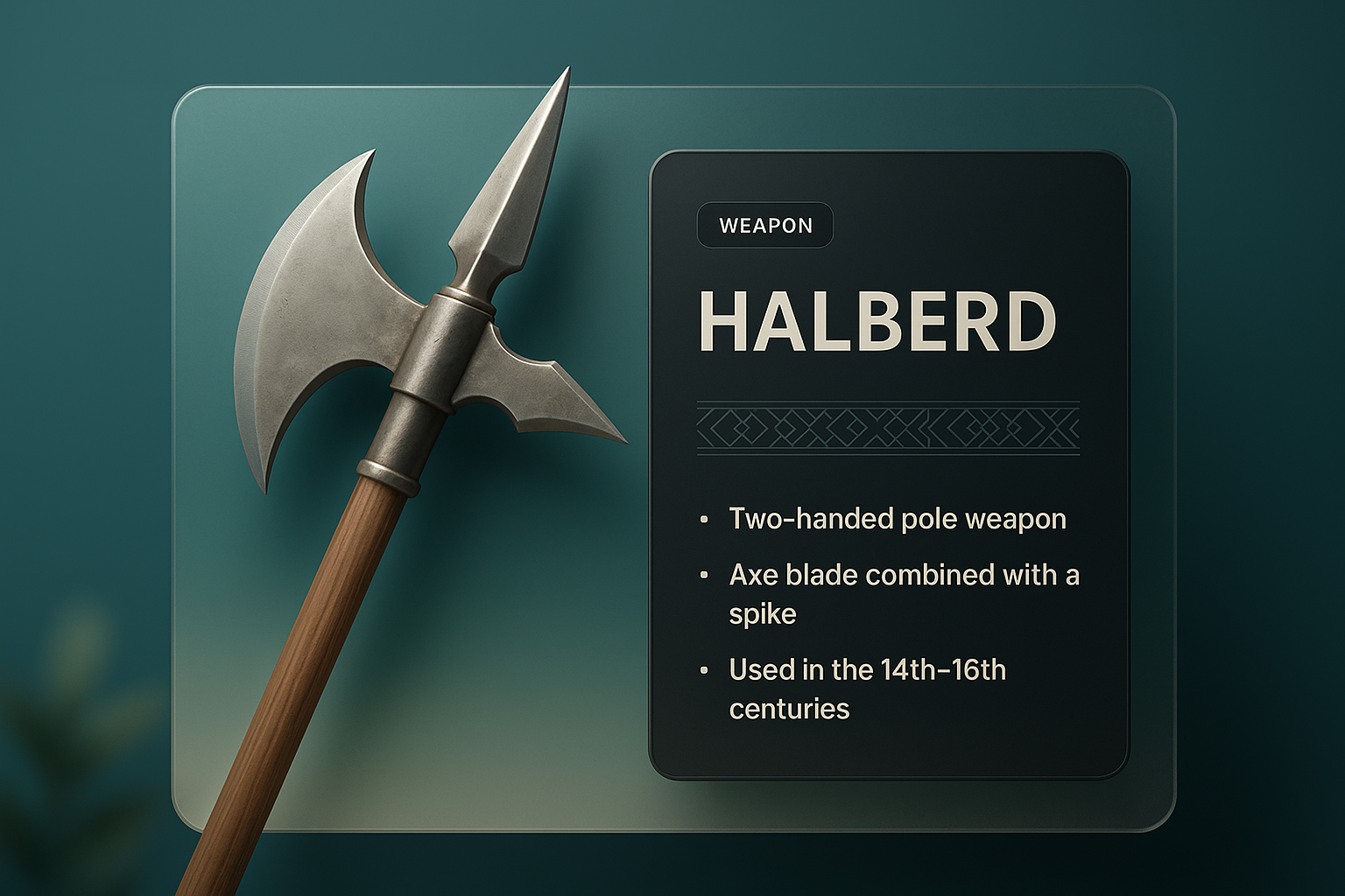 A detailed 3D rendering of a halberd weapon, featuring a dark overlay with descriptive text. The background has a smooth gradient that complements the design.