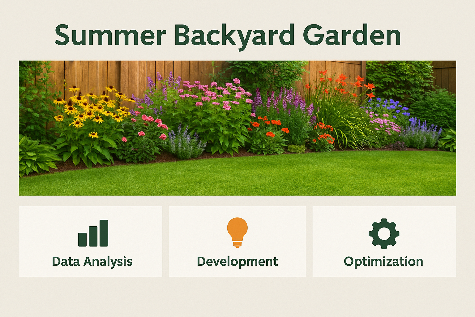 /Collection: /by davooda/Type: PNG/A visually appealing summer backyard garden image featuring colorful flowers, accompanied by sections for data analysis, development, and optimization, ideal for landscaping or gardening presentations.