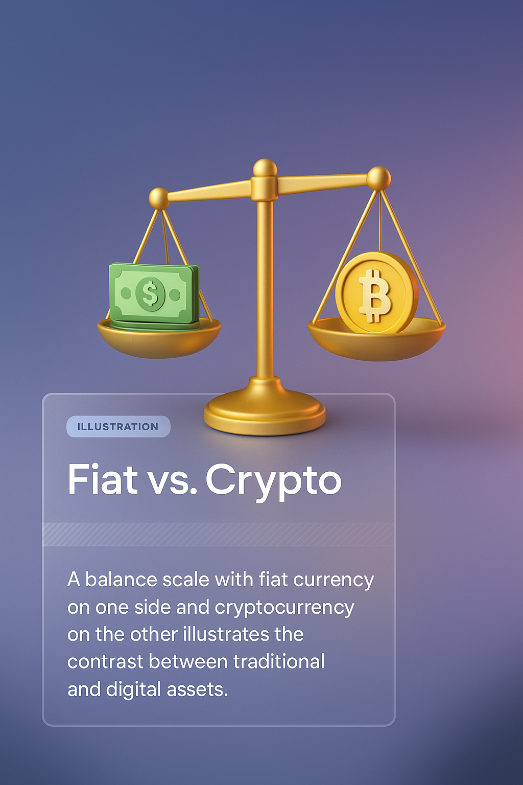 A 3D illustration features a balance scale weighing fiat currency against cryptocurrency. The gradient background enhances the visual appeal, while the informative text block provides context.