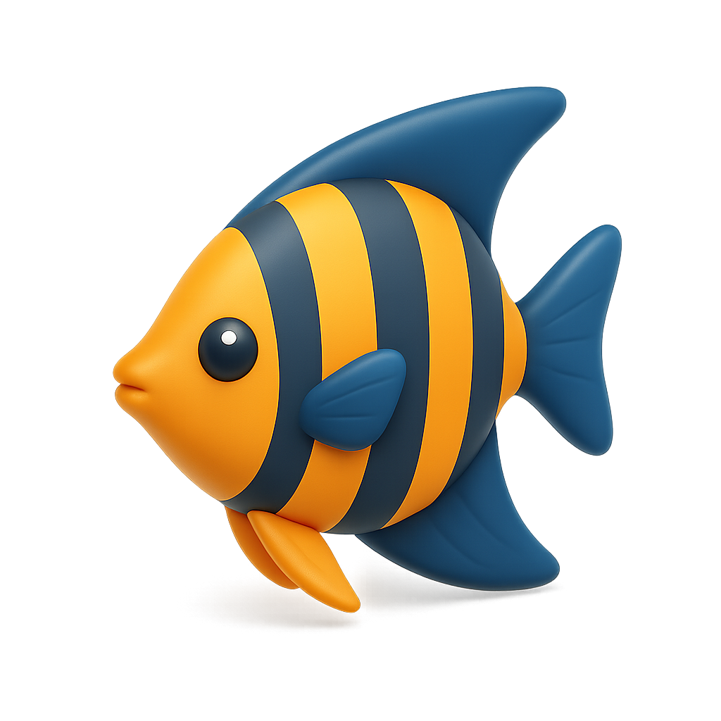 A vibrant 3D representation of an angelfish featuring bold orange and blue stripes. The fish is depicted in a three-quarter view with a smooth, glossy finish, set against a gradient background.