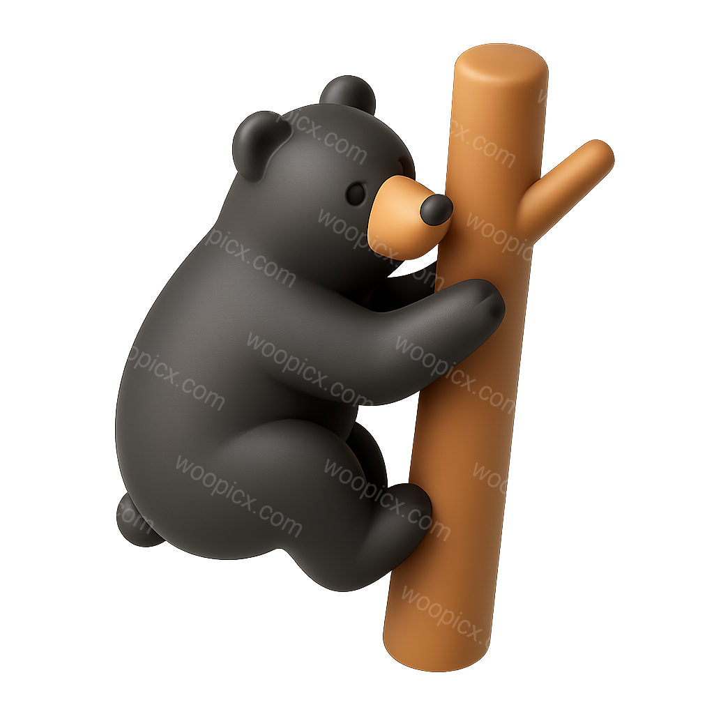 A stylized 3D icon of a black bear climbing a tree branch, designed with a transparent background. The bear is depicted in a three-quarter view, showcasing a volumetric and isometric appearance.
