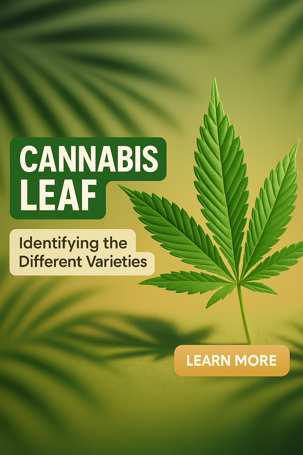 A visually appealing graphic showcasing a cannabis leaf with a focus on identifying different varieties. Designed for educational purposes, it features a clean layout and vibrant colors.