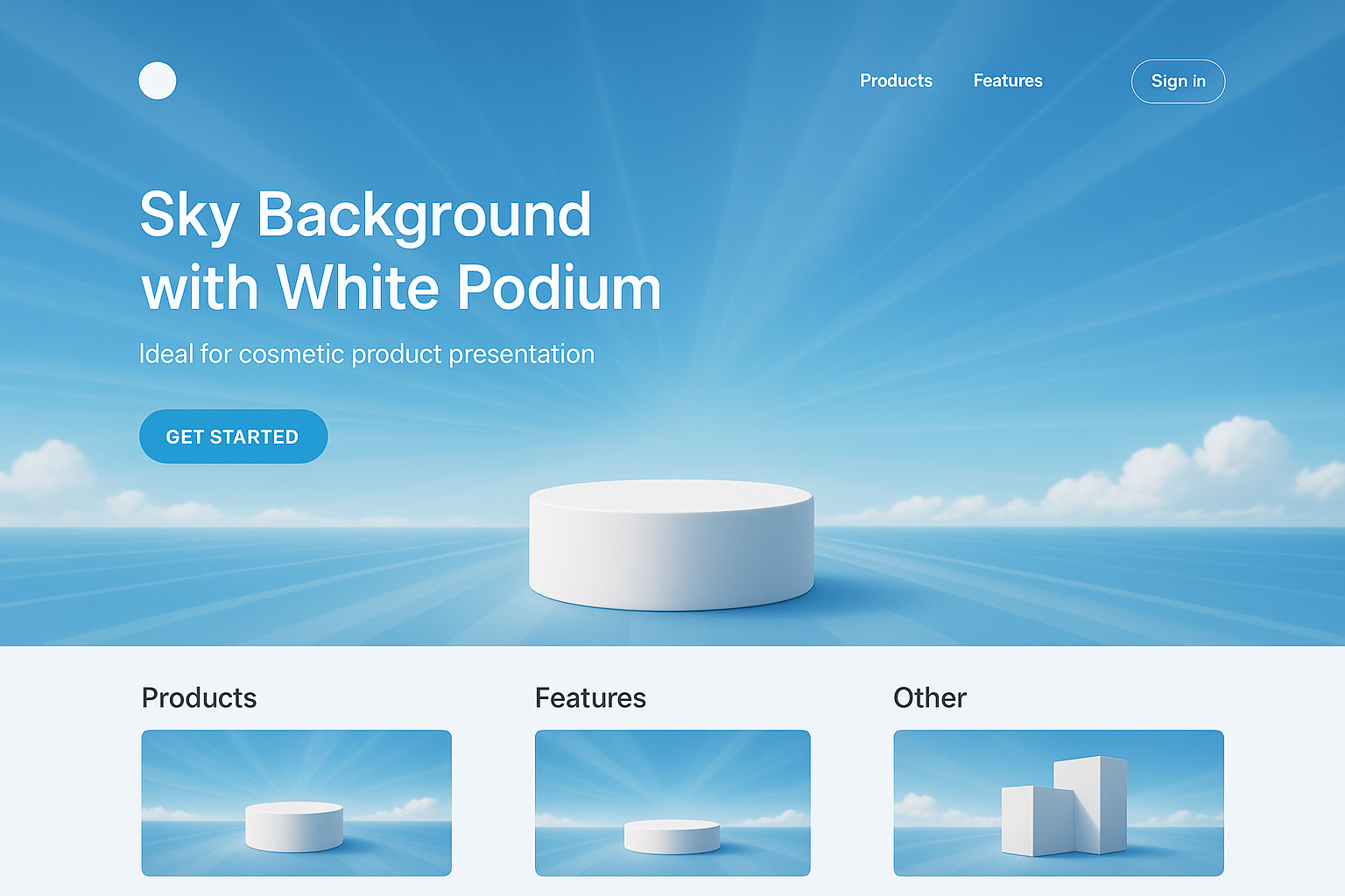 /Collection: /by davooda/Type: PNG/A vibrant sky background featuring a white podium, ideal for showcasing cosmetic products. The scene includes dynamic rays and a clear blue sky, providing ample space for text.