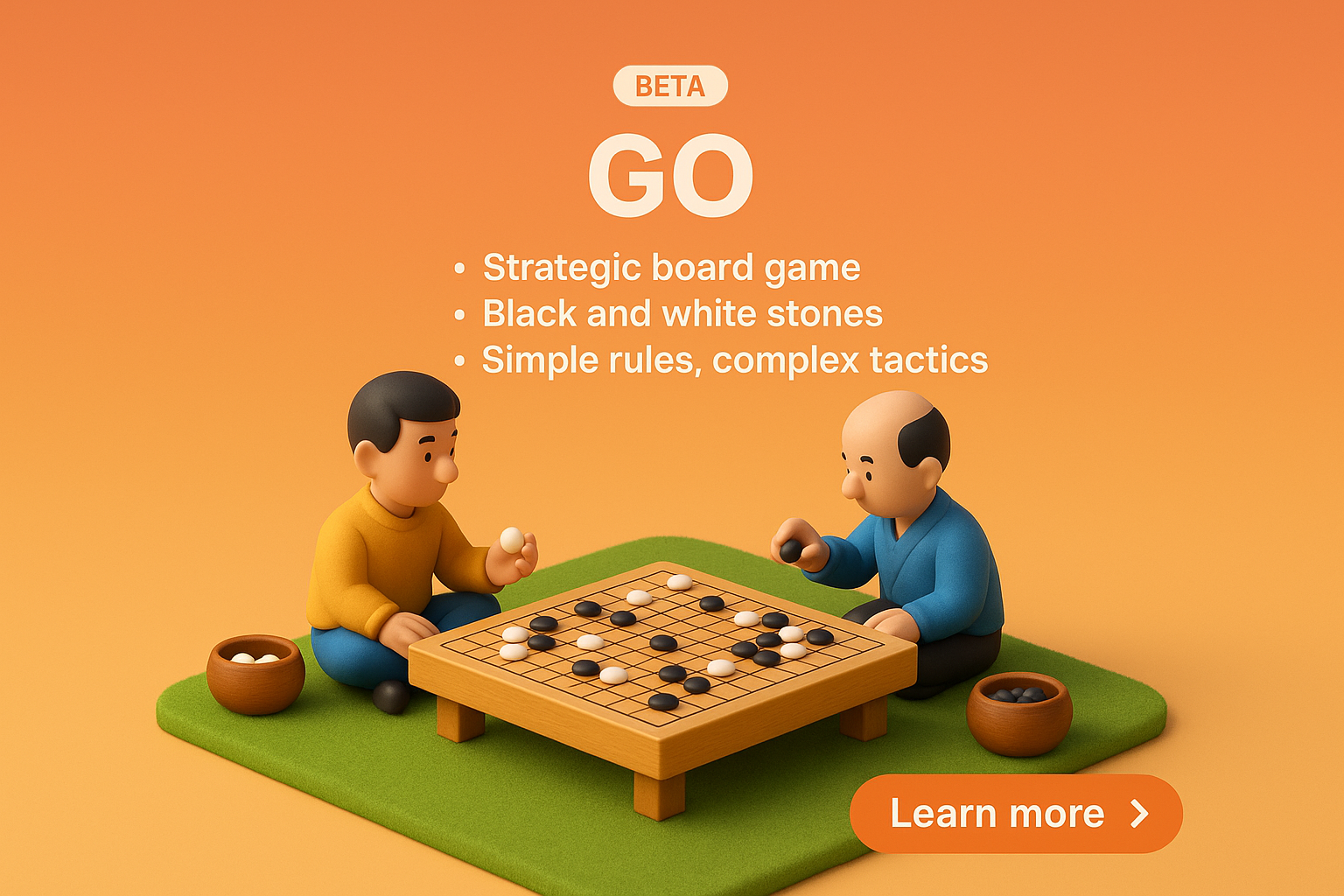 A vibrant 3D illustration depicting two players engaged in a Go board game. The scene features a simple gradient background and highlights the strategic nature of the game with black and white stones.