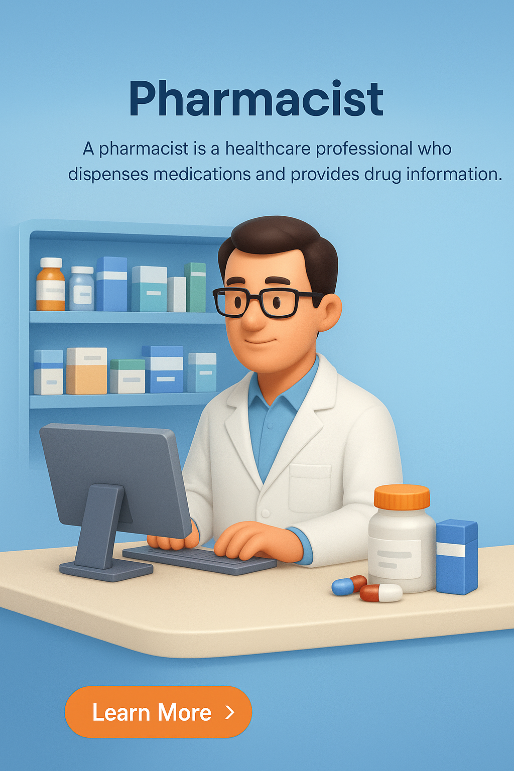 A zoomed-out 3D illustration featuring a pharmacist working at a counter, with shelves of medications in the background. The scene is designed with a smooth gradient backdrop and clear, readable text.