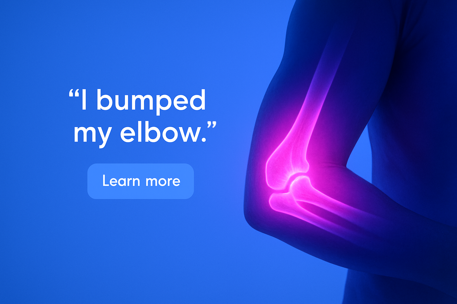 /Collection: /by davooda/Type: PNG/An artistic representation of a glowing elbow against a solid blue background. The elbow emits a vibrant neon pink glow, illuminating the surrounding space in cool shades of blue and violet. A quote about bumping the elbow and a 'Learn more' button are included.