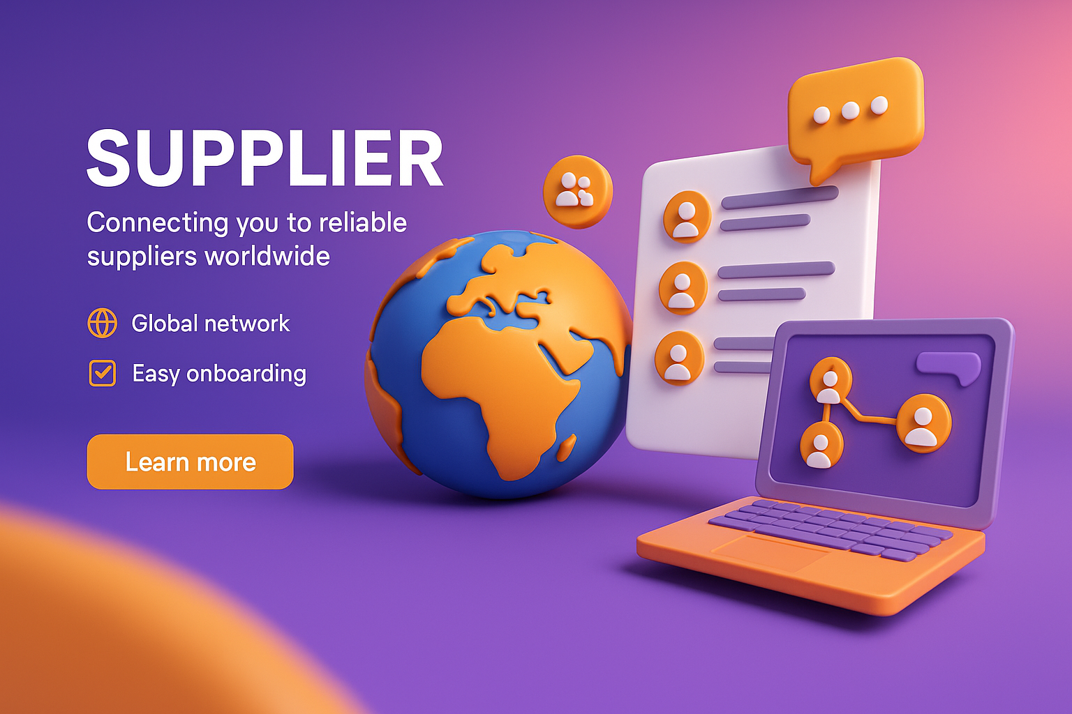 /Collection: /by davooda/Type: PNG/A vibrant 3D graphic illustrating a global supplier connection platform, featuring a stylized globe, laptop, and chat elements. Ideal for digital marketing and tech-focused websites.