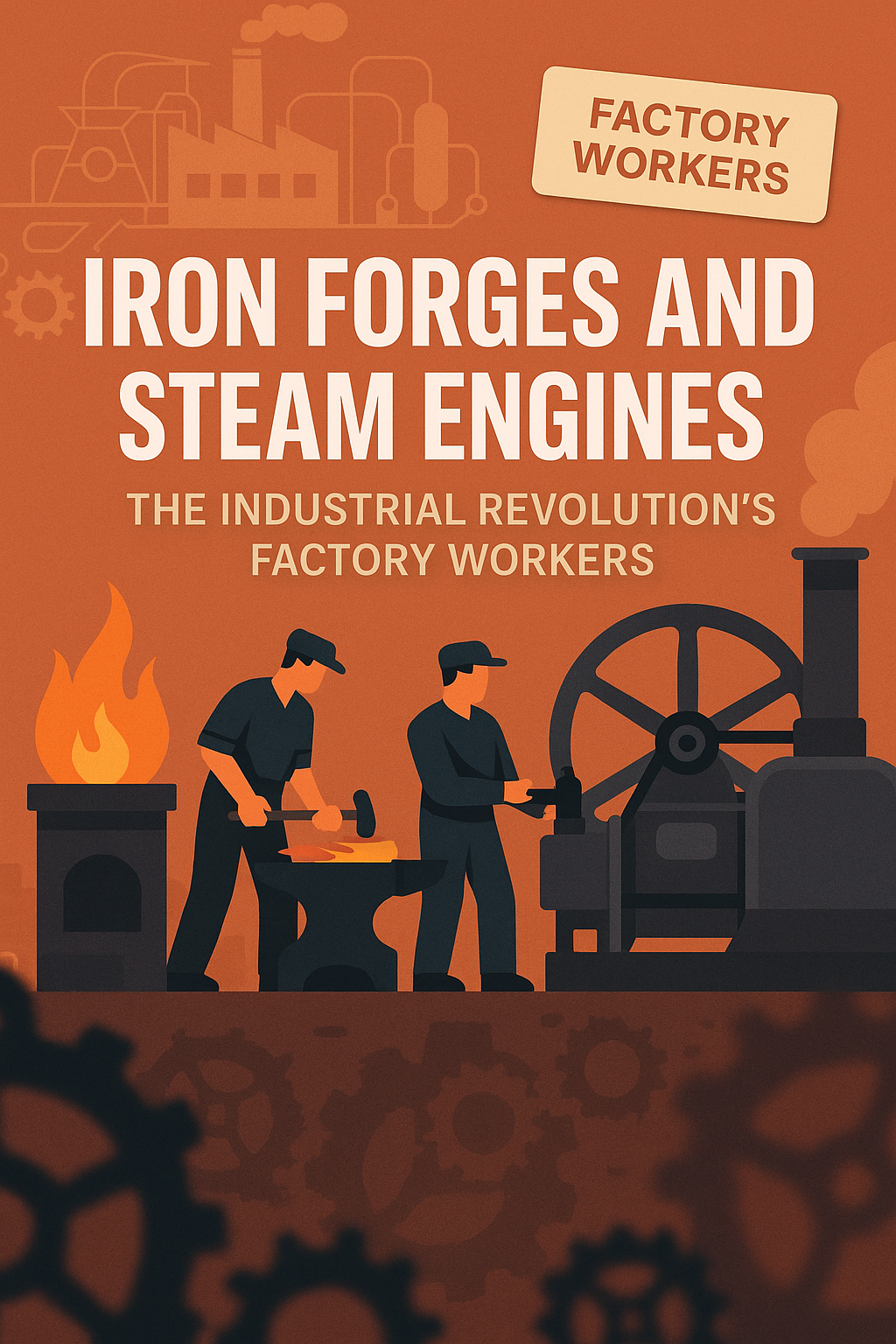 /Collection: /by davooda/Type: PNG/A visually engaging illustration depicting factory workers engaged in iron forges and steam engines, capturing the essence of the Industrial Revolution. Suitable for educational content.