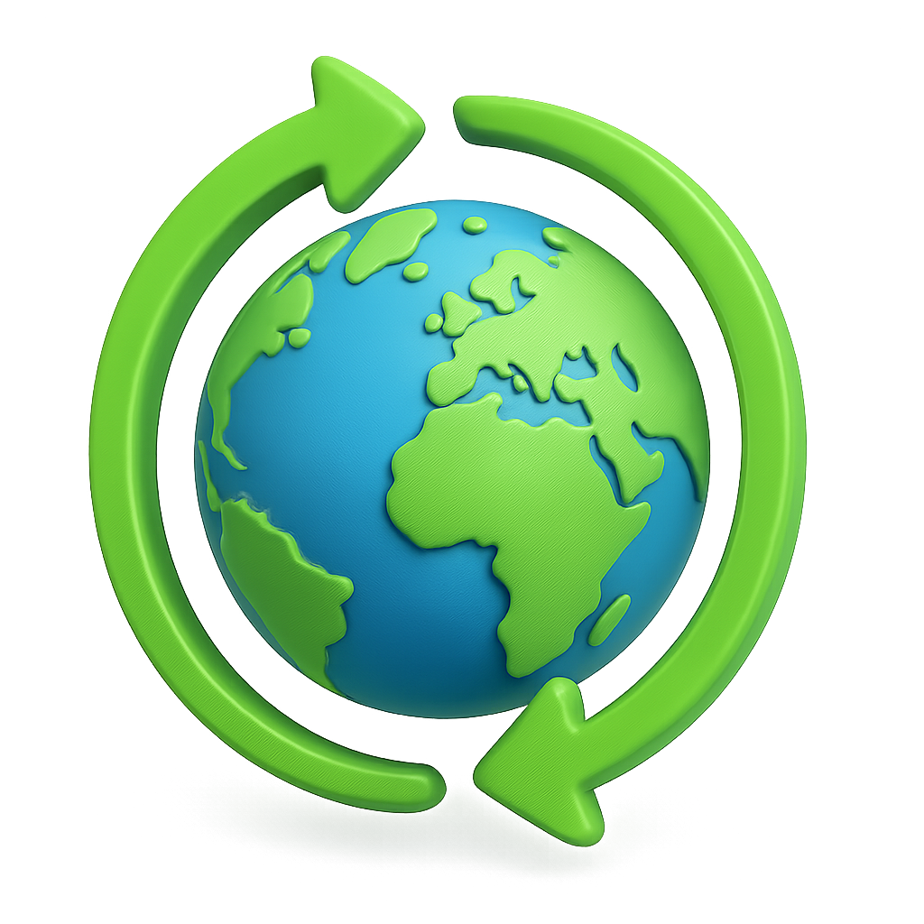 A vibrant 3D globe icon featuring a green and blue earth with circular arrows around it, designed in a three-quarter isometric view on a transparent background.