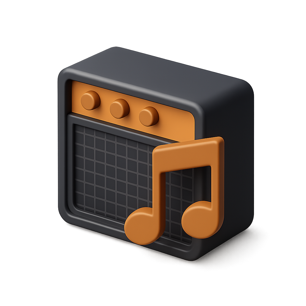 A modern 3D music amplifier icon featuring a sleek design with a black body and orange accents. The icon showcases musical notes, emphasizing its audio theme.