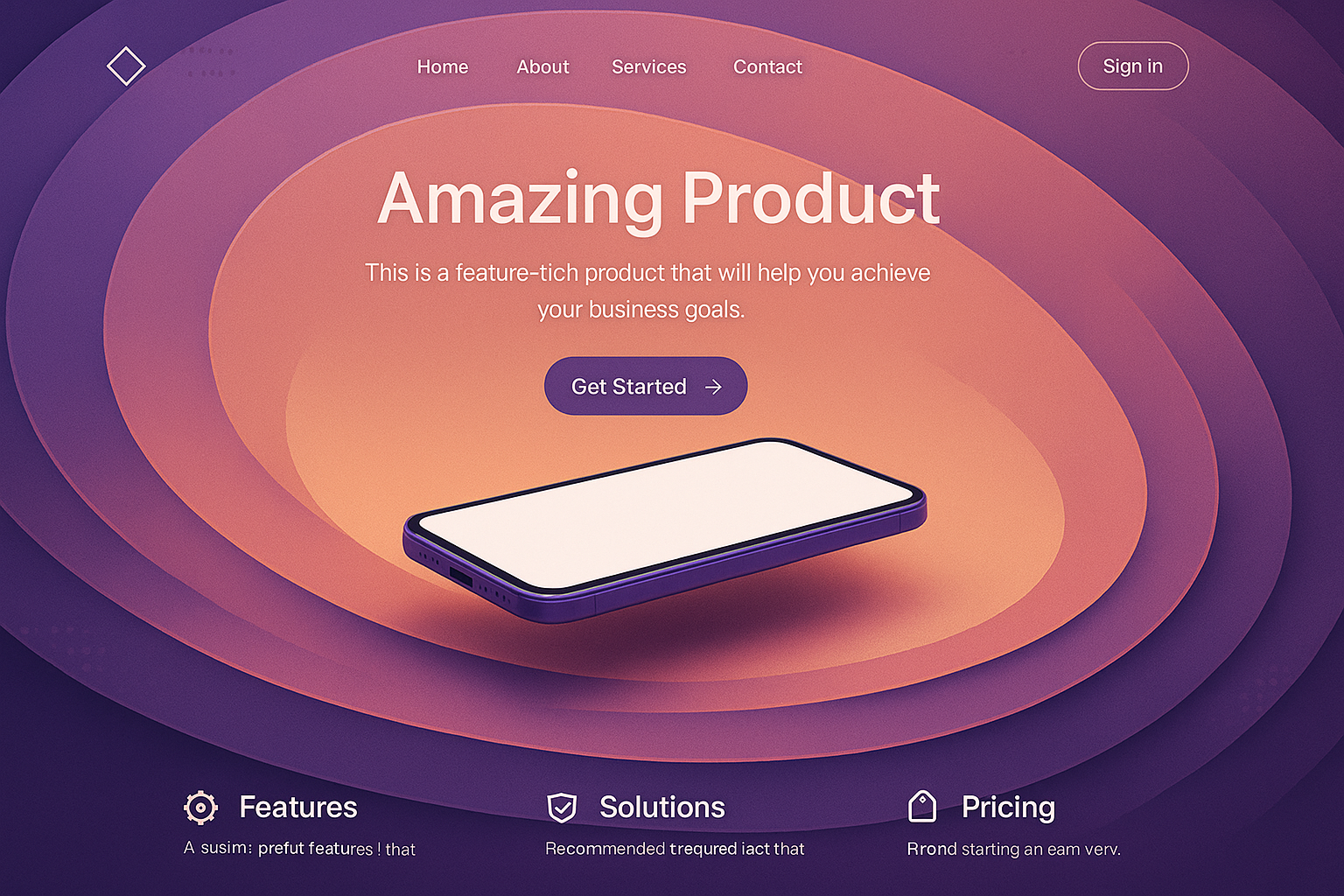 /Collection: /by davooda/Type: PNG/A visually striking landing page design featuring a purple smartphone, concentric layers, and modern UI elements. The layout includes buttons, icons, and section headers, all designed for clarity.