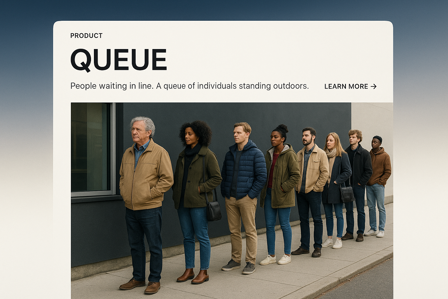 A web design layout showcasing a queue of diverse individuals standing outdoors, with a clean, modern aesthetic and well-structured text elements.