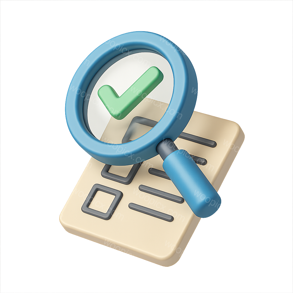 A 3D isometric icon featuring a magnifying glass over a checklist with a green checkmark. The design emphasizes depth and volume, perfect for digital interfaces.
