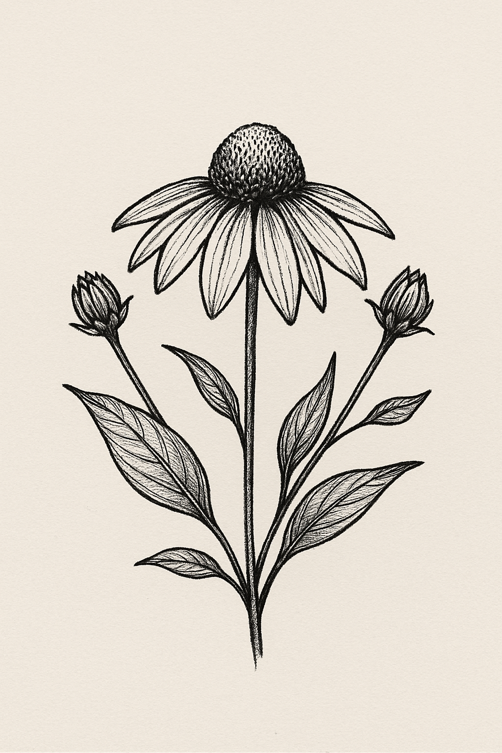 /Collection: /by davooda/Type: PNG/This image features a detailed black and white illustration of a flower and buds, showcasing intricate line work. Ideal for nature-themed decor or educational materials.
