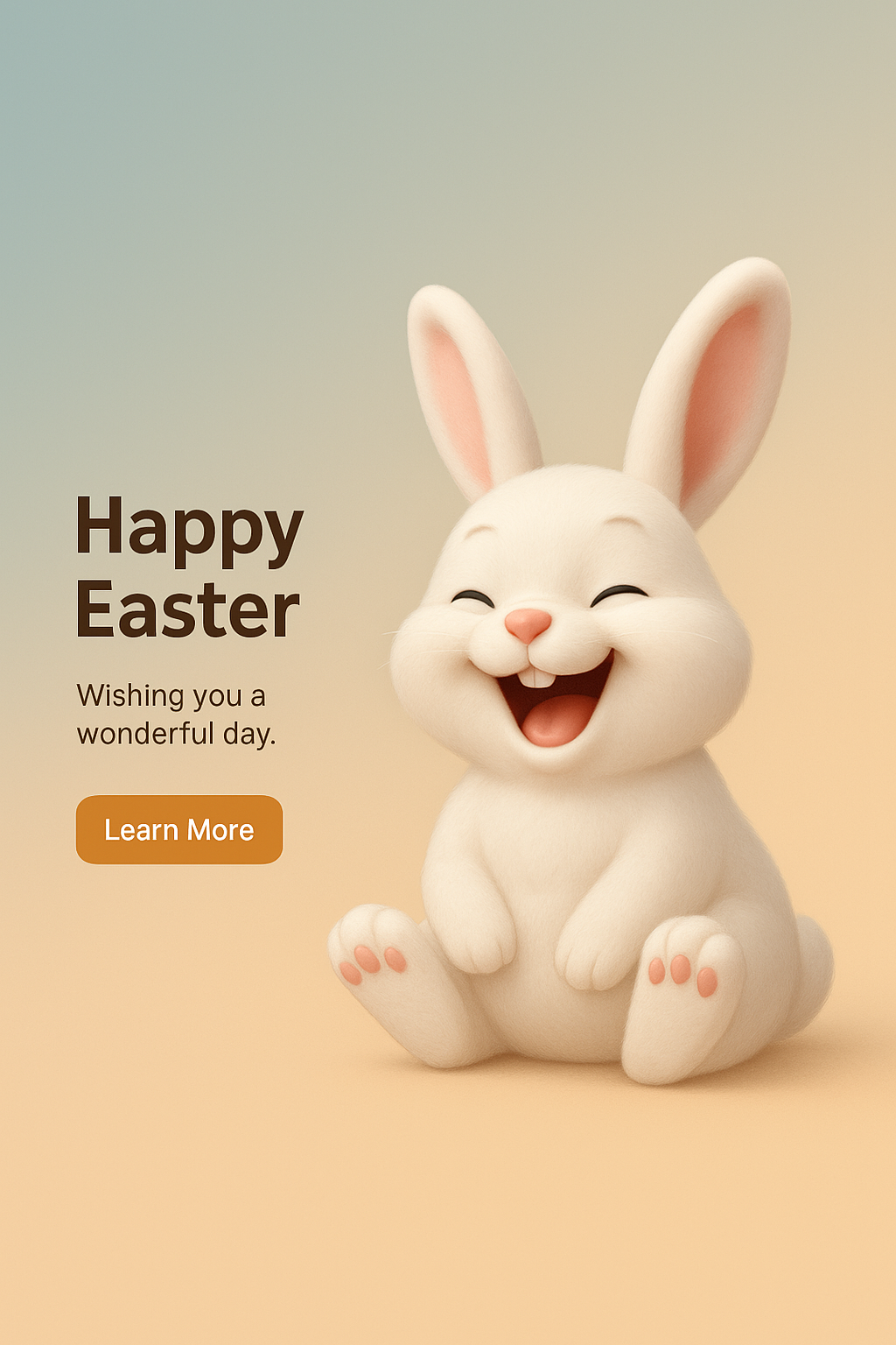 A delightful 3D illustration of a smiling white rabbit, perfect for Easter themes. The background features a smooth gradient, enhancing the cheerful mood of the scene.