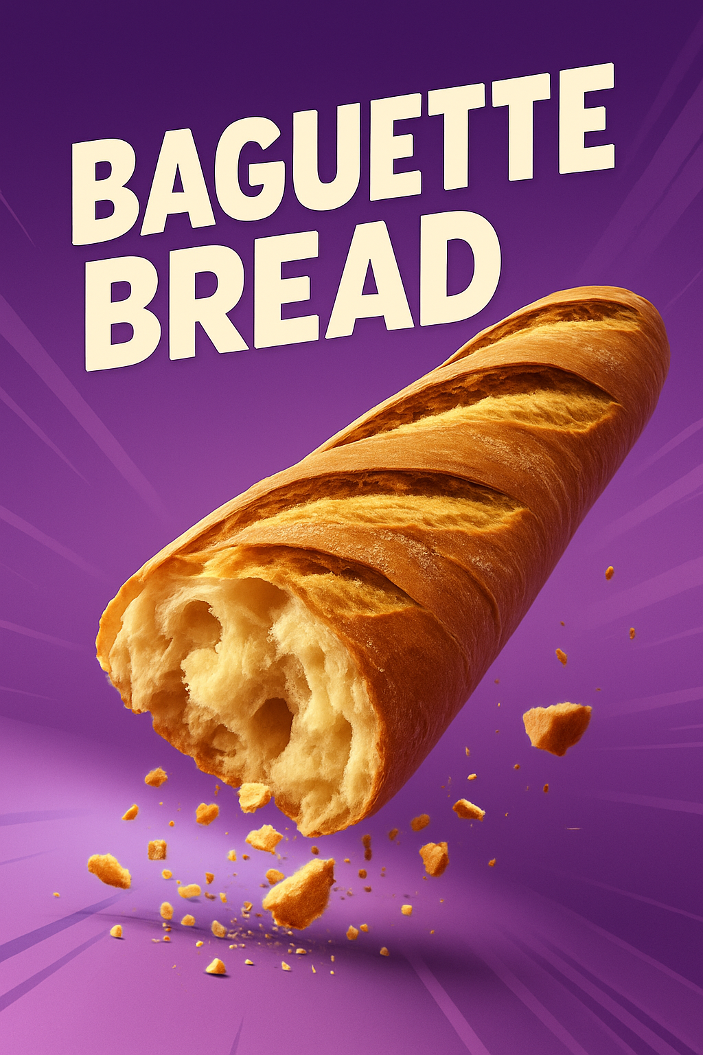 /Collection: /by davooda/Type: PNG/A visually striking depiction of a baguette bread with falling crumbs, set against a vibrant gradient background. The dynamic angle enhances the sense of motion and freshness.