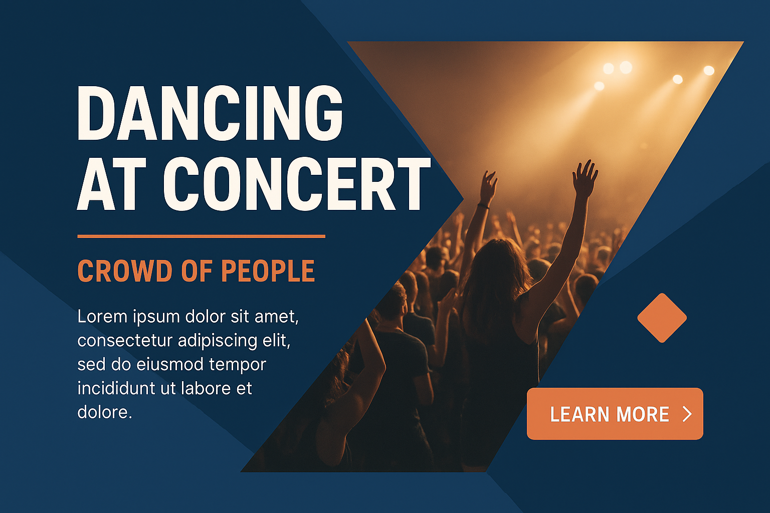 /Collection: /by davooda/Type: PNG/A lively scene capturing a crowd of people dancing at a concert. The design features a geometric layout with contrasting colors, engaging text elements, and a clear call to action button.