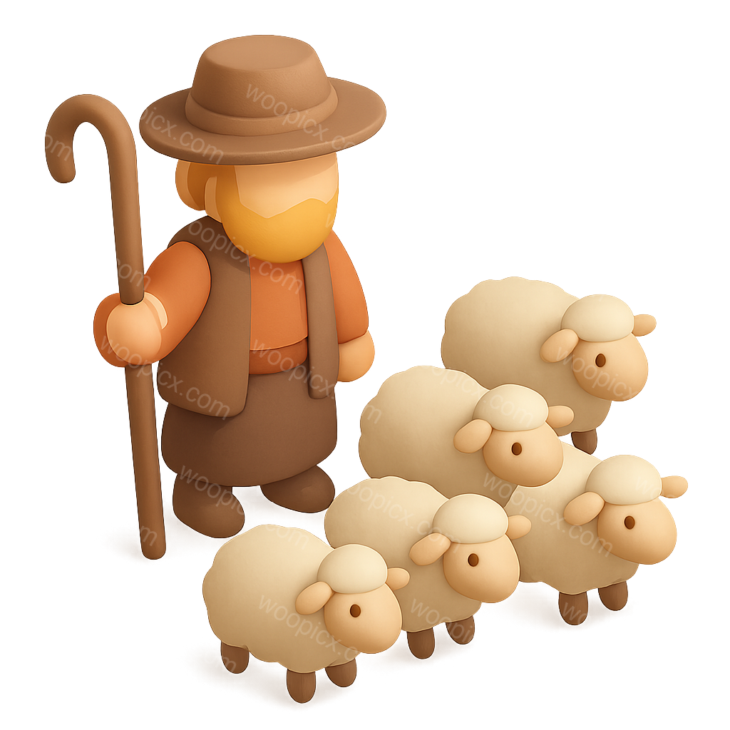/Premium/Collection: /by davooda/Type: PNG/A charming 3D icon depicting a shepherd with a flock of sheep, designed in an isometric style. The shepherd stands with a staff, surrounded by fluffy sheep, all presented with a soft color palette.