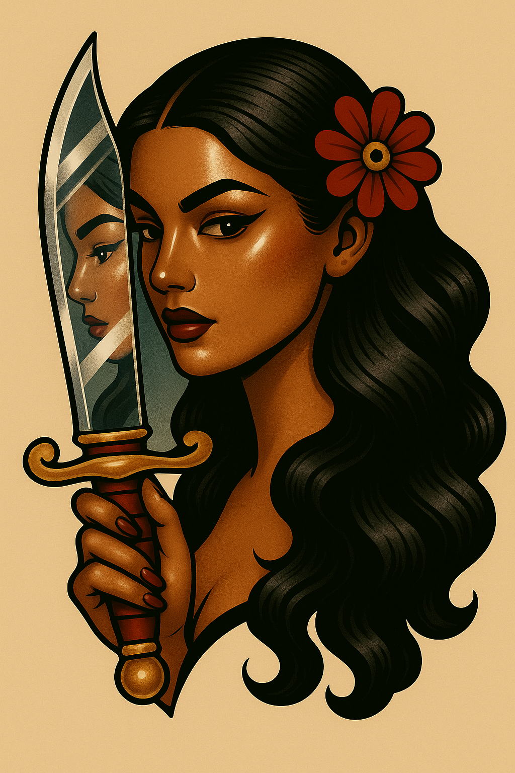 /Collection: /by davooda/Type: PNG/A striking illustration of a woman holding a blade, with her reflection visible on the shiny surface. The artwork features a glossy, tattoo-like style with anime-inspired highlights, set against a soft beige background.