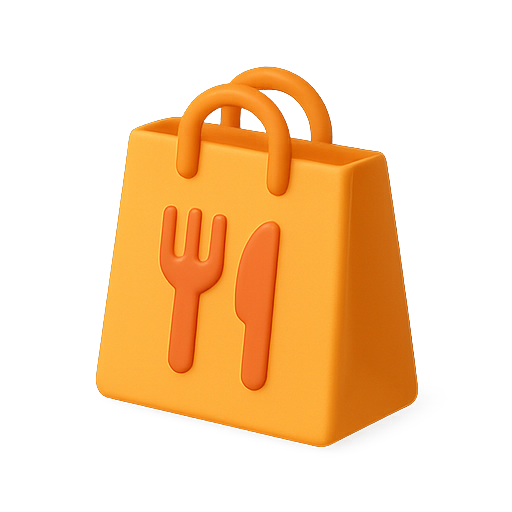A vibrant orange icon representing food delivery, featuring a bag design with fork and knife motifs. This graphic is ideal for apps or websites focused on food services.