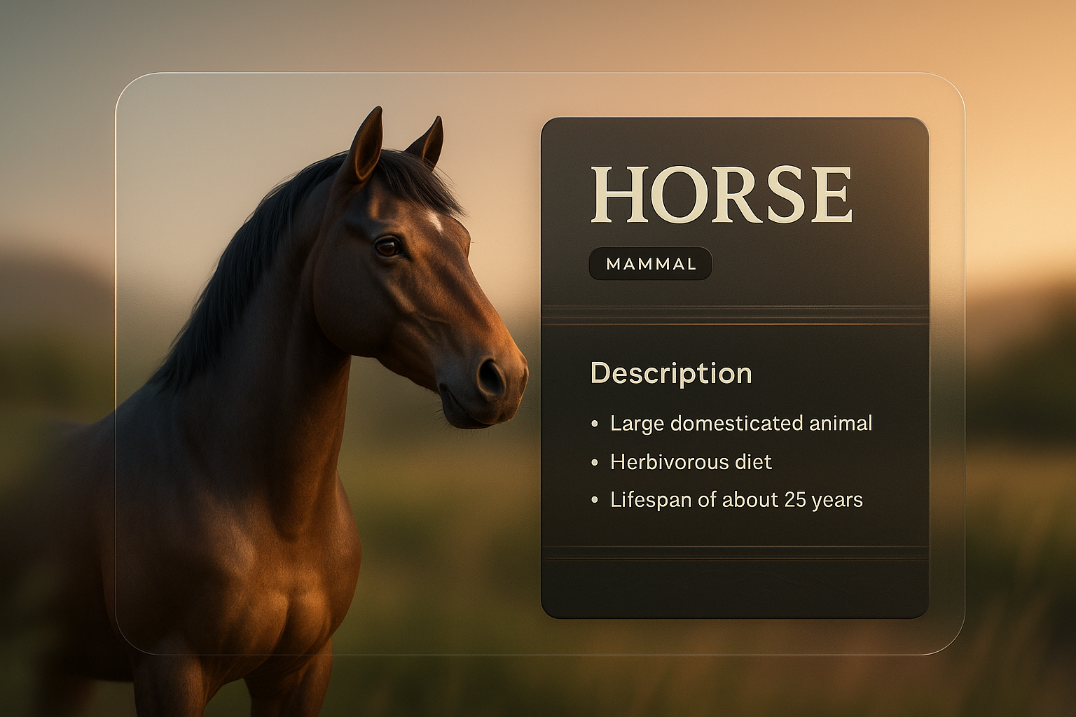 A stunning 3D illustration of a horse set against a smooth gradient background. It features an integrated info block detailing the horse's characteristics.
