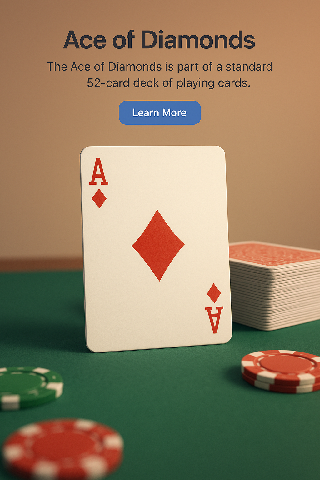 /Collection: /by davooda/Type: PNG/A realistic 3D rendering of the Ace of Diamonds playing card, placed on a green table with poker chips. The design features a soft gradient background and clear text elements.