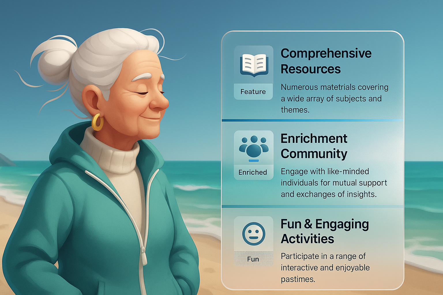 /Collection: /by davooda/Type: PNG/A serene illustration of a mature woman on a beach, accompanied by visually integrated informational blocks showcasing features, community engagement, and activities.