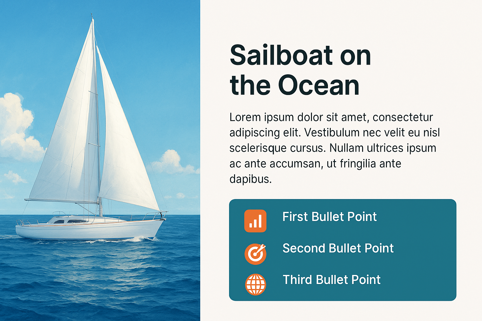A serene image of a sailboat on the ocean, accompanied by bullet points for informational purposes, ideal for presentations or promotional materials.