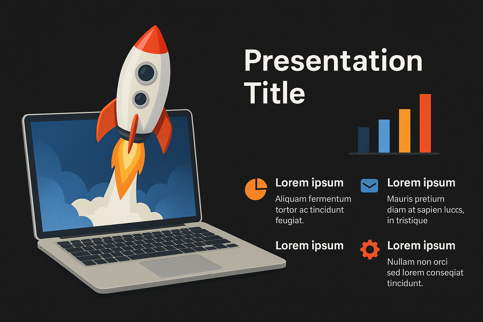 /Collection: /by davooda/Type: PNG/Stylish presentation slide design showcasing a rocket launching from a laptop, ideal for tech or innovation topics. Features a dark background and clean layout.