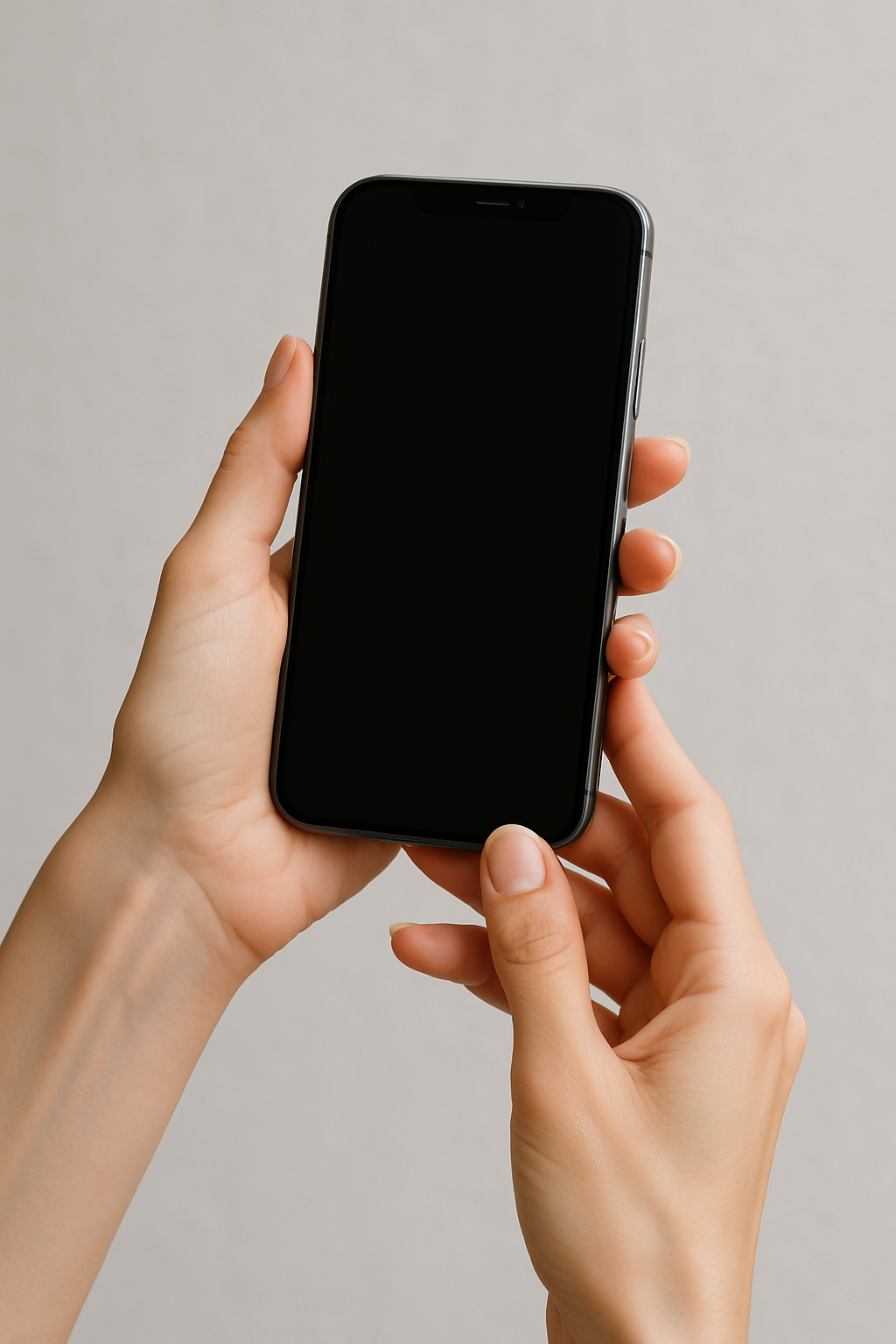 A clean and minimalist smartphone mockup held in hands, ideal for showcasing app designs or digital interfaces. The neutral background emphasizes the device.