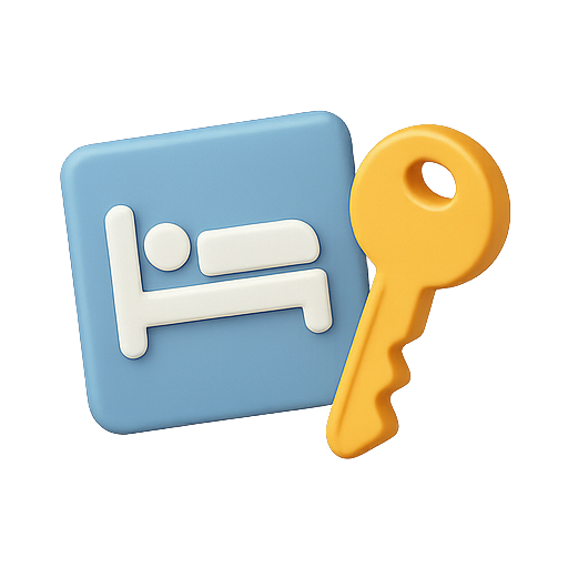 A modern graphic icon featuring a bed symbol and a key, representing lodging and access. Ideal for travel, hospitality, or booking applications.