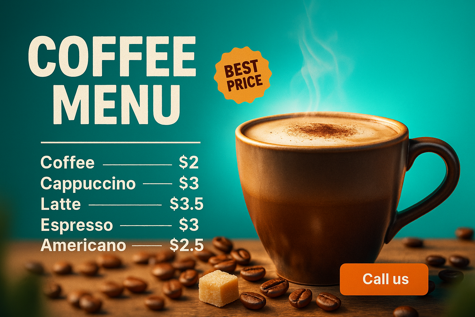 Dynamic Coffee Menu Featuring Prices and Call to Action