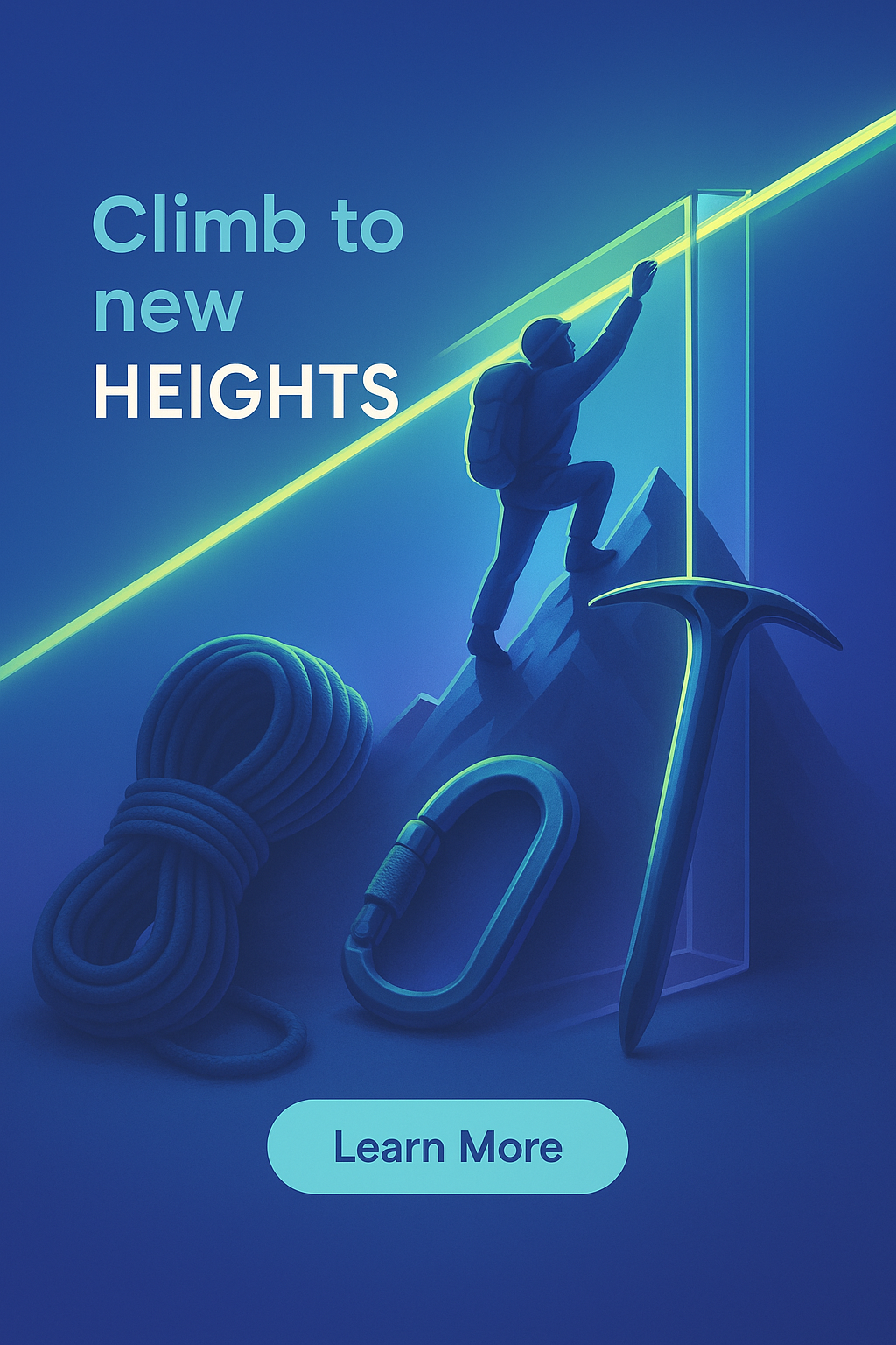 /Collection: /by davooda/Type: PNG/A climber ascends a mountain, illuminated by neon lines. The scene features climbing gear like rope and carabiner against a vibrant blue background, creating a striking visual atmosphere.