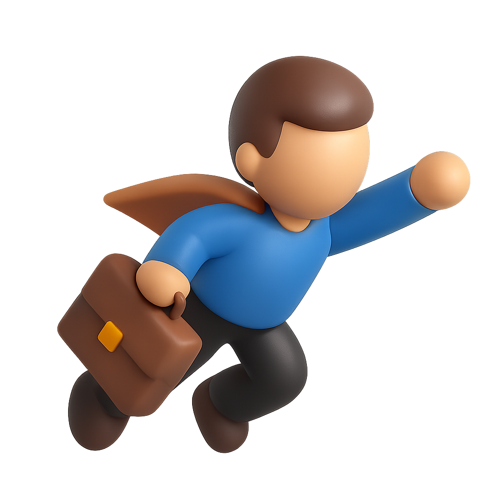 A stylized 3D icon showing a person in mid-flight, holding a briefcase. The character has a blue shirt and a brown briefcase, designed with a three-quarter perspective.