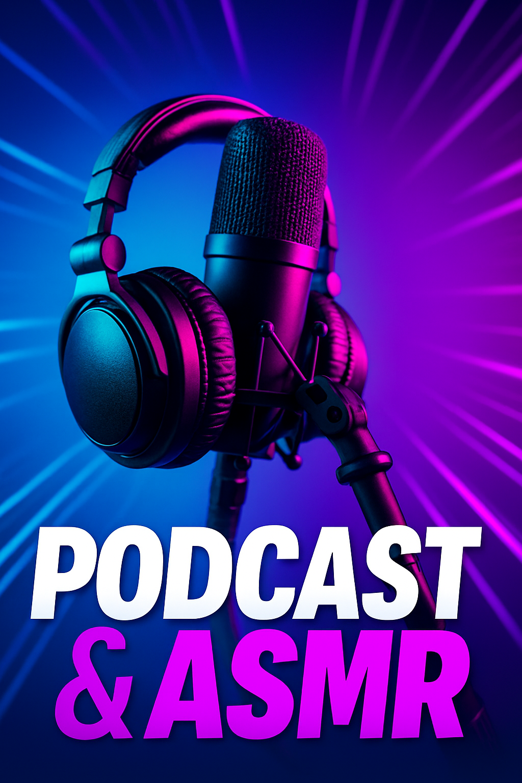 /Collection: /by davooda/Type: PNG/A striking close-up of a microphone and headphones designed for podcasting and ASMR, illuminated by dynamic cyan and magenta neon lights, creating a vibrant studio atmosphere.