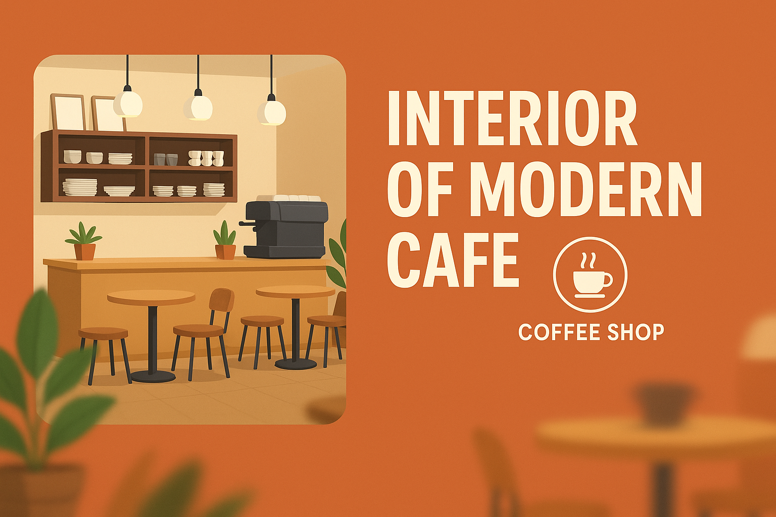 A vibrant illustration depicting the interior of a modern coffee shop, featuring a cozy atmosphere with stylish furniture and decorative plants, ideal for cafe branding or interior design concepts.