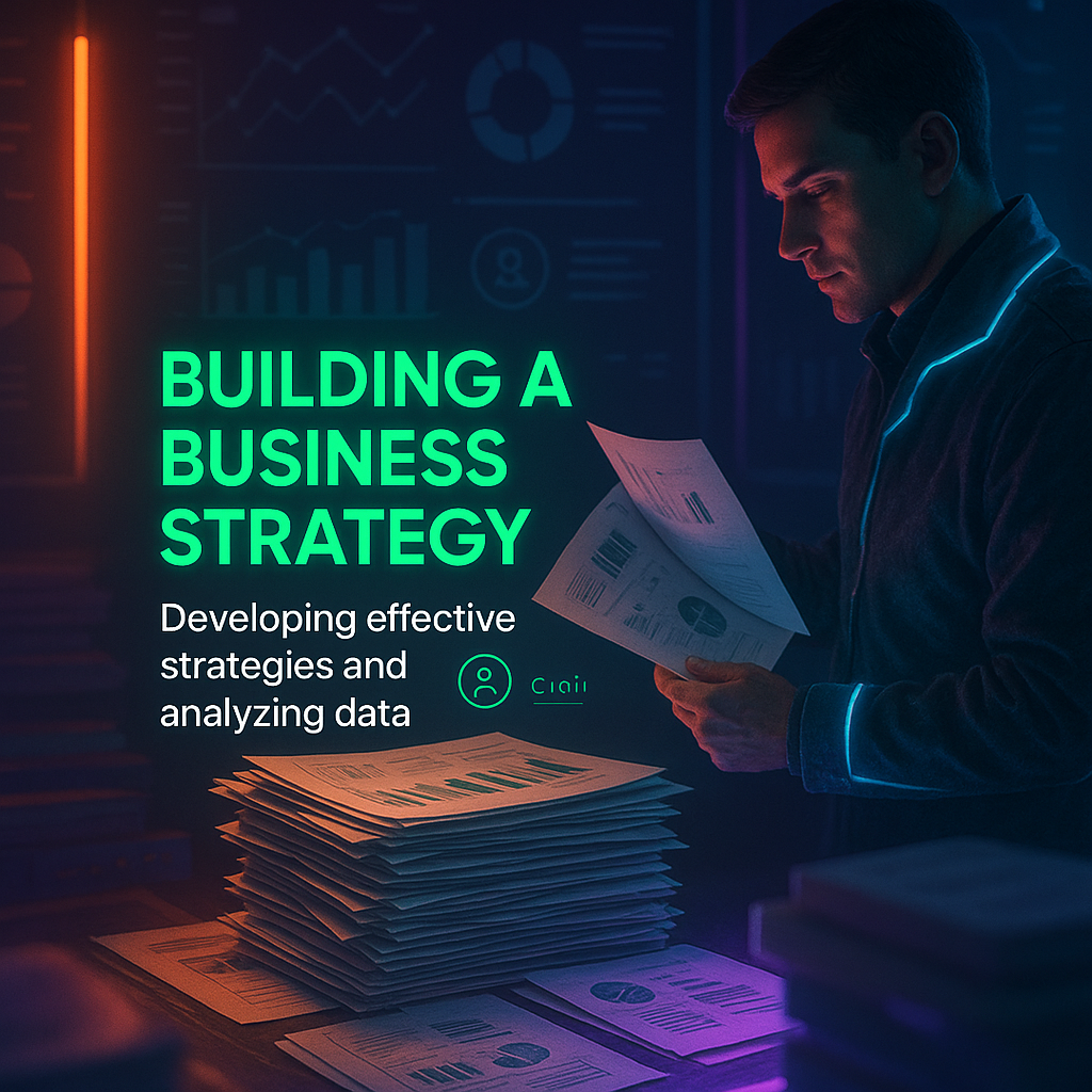 /Collection: /by davooda/Type: PNG/A visually striking graphic representing business strategy development and data analysis. The image features a professional examining documents in a dimly lit environment, suitable for corporate presentations or social media posts.