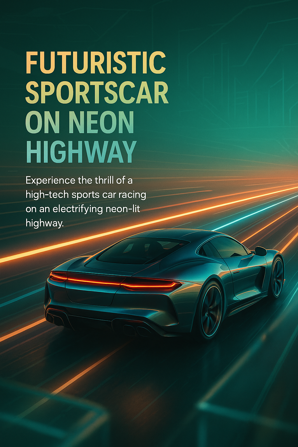 Dynamic digital artwork showcasing a futuristic sports car racing on a neon-lit highway, ideal for automotive promotions and tech-themed graphics.