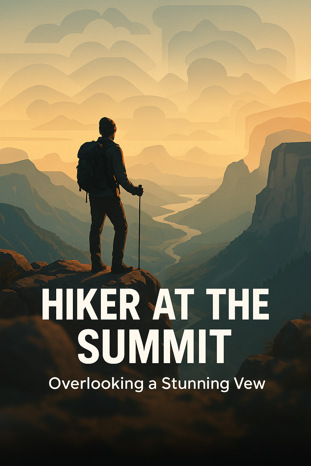 A visually striking illustration of a hiker at the summit, overlooking a breathtaking landscape. The warm color palette and stylized clouds create a sense of adventure, perfect for travel and outdoor enthusiasts.